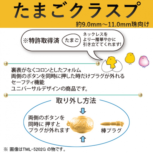 コロンとした見た目が印象的なたまご型クラスプ。裏表がない両面デザインでフォルム両側のボタンを同時に押した時だけプラグが外れるセーフティ機能型のユニバーサルデザイン商品です。真珠との親和性を高めた形状で、使いやすくネックレスなどに溶込むシルエットです。糸・ワイヤーどちらにでも連組が可能でネックレスやブレスレットなど様々なアイテムにご使用できます。