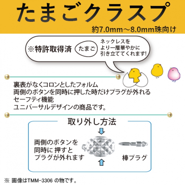 コロンとした見た目が印象的なたまご型クラスプ。裏表がない両面デザインでフォルム両側のボタンを同時に押した時だけプラグが外れるセーフティ機能型のユニバーサルデザイン商品です。真珠との親和性を高めた形状で、使いやすくネックレスなどに溶込むシルエットです。糸・ワイヤーどちらにでも連組が可能でネックレスやブレスレットなど様々なアイテムにご使用できます。